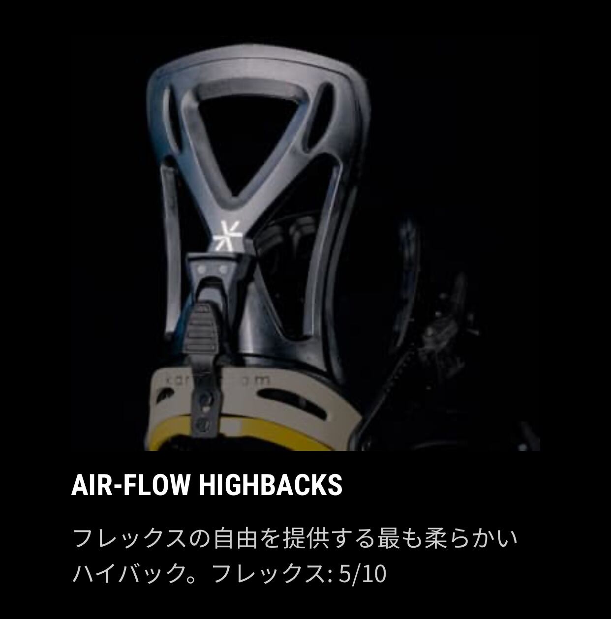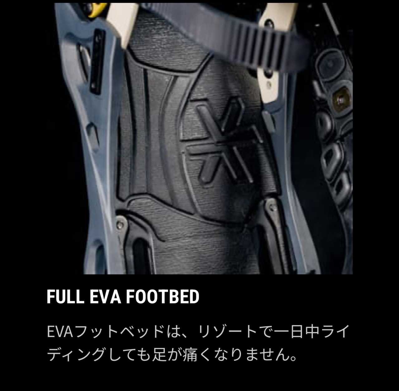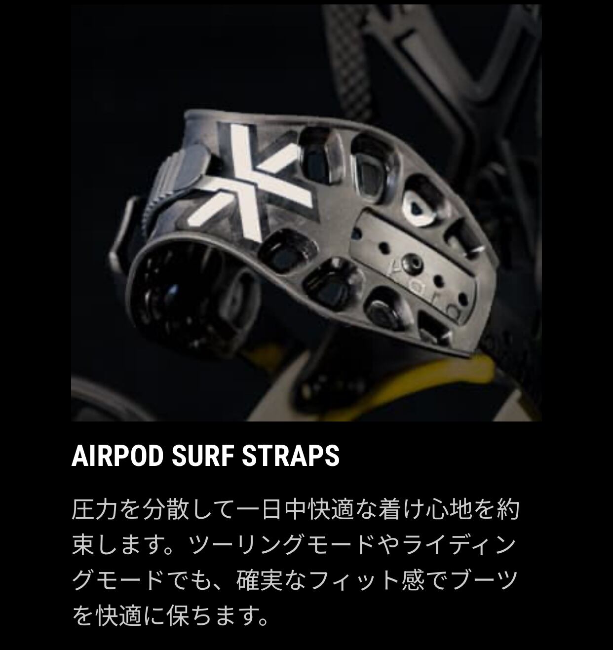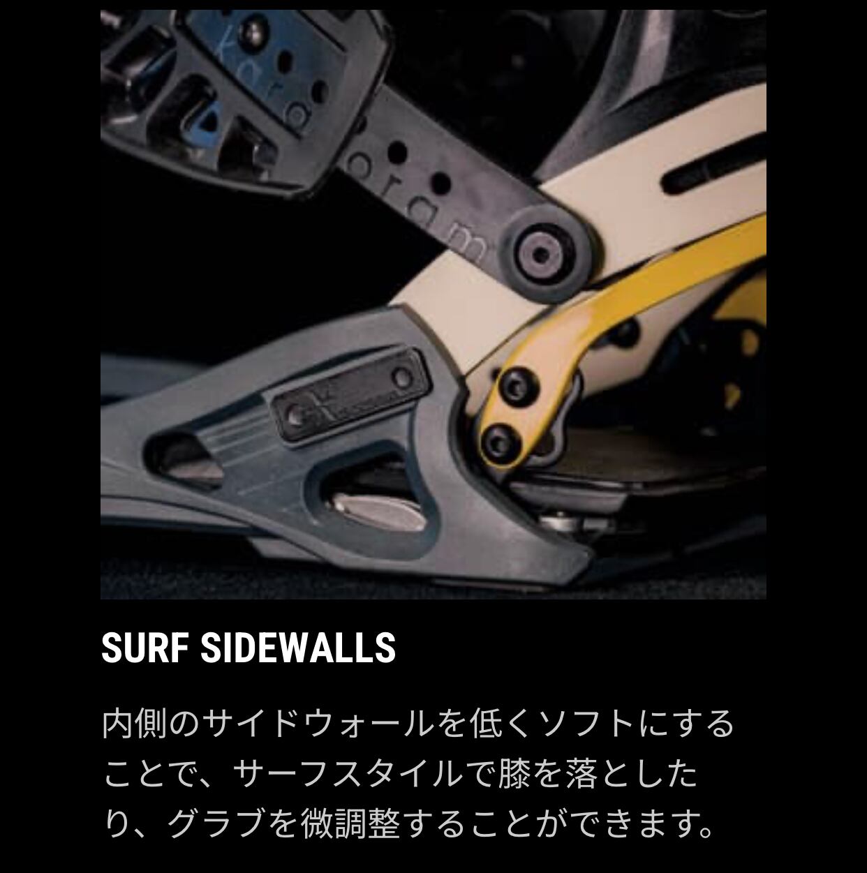 文字通りレイバック(気楽な)レスポンス。柔らかいレスポンスとフレックスパター ンにより、サーフ感覚の乗り味を与えるLAYBACK(レイバック)。新開発のサーフサイドウォールにより自由な動きと、3D 成形のEVA 素材フットベッドによりブーツ裏に最高のフィット感とクッション性を。そしてサーフストラップが、自由な足首の動きを約束します。